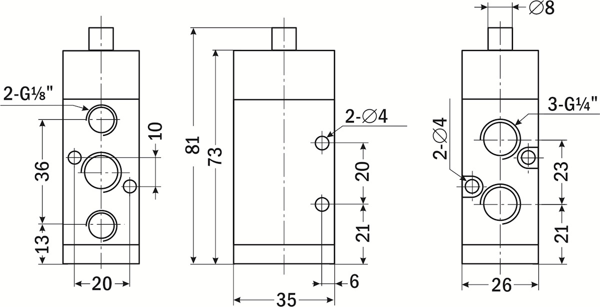 • Присоединение: G¼" (рабочие порты), G⅛" (порты выхлопа)
