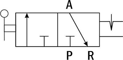 В исходном положении порт питания P перекрыт, рабочий порт А соединен с портом выхлопа R. При повороте рукоятки порт питания Р соединяется с рабочим портом А, а порт выхлопа R перекрывается. При возврате рукоятки в начальное положение золотник также возвращается в исходное положение.