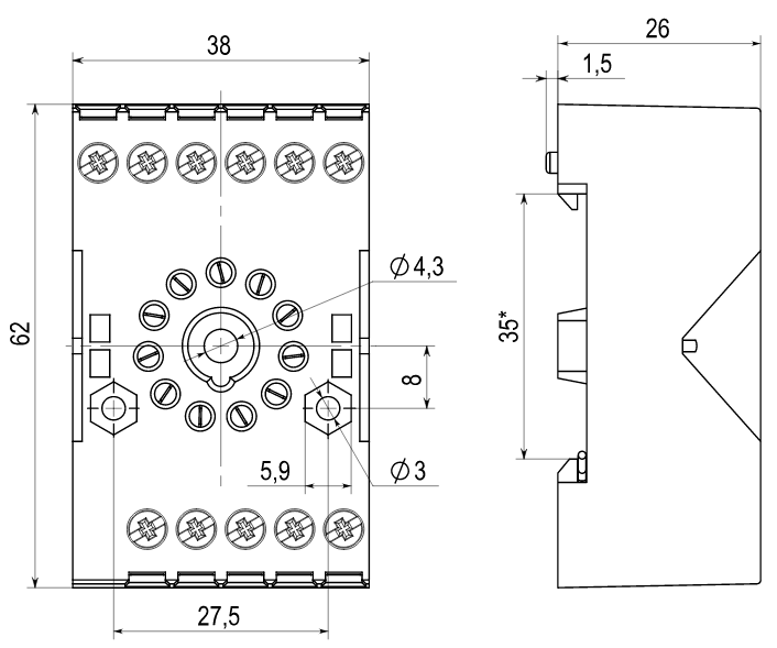 | Описание | монтажная колодка с винтовыми клеммами для 3-контактного реле |