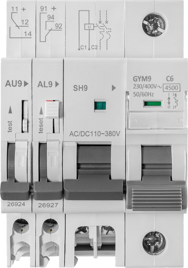 - Возможность расширения функционала. Расцепитель SH9, аварийный контакт AL9 или дополнительный контакт AU9 устанавливаются слева к автомату, возможна установка не более трех приборов одновременно. Если в сборке используется расцепитель, то сначала устанавливается он, затем аварийный и вспомогательный контакты в любом порядке