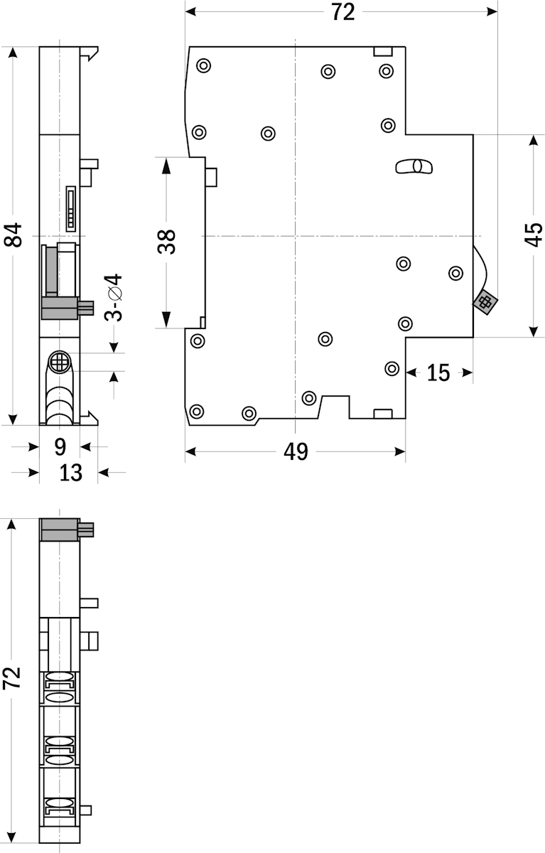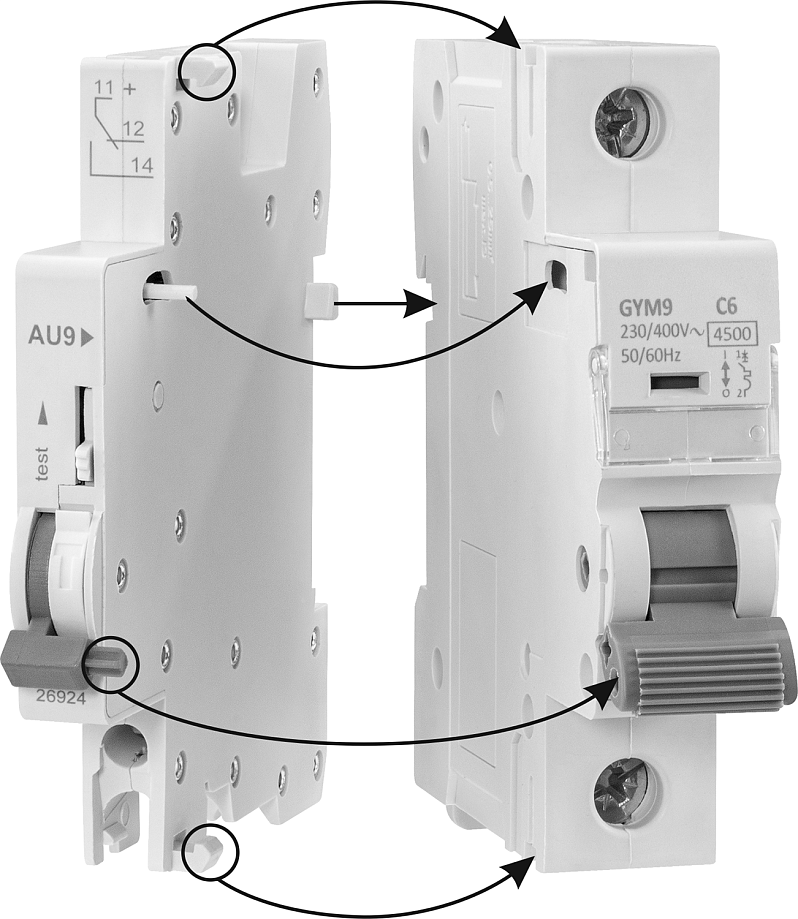 - Может устанавливаться на автомат вместе с расцепителем SH9 и аварийным контактом AL9, возможна установка не более трех приборов одновременно, слева от автомата. Если в сборке используется расцепитель, сначала устанавливается он, затем аварийный и вспомогательный контакты в любом порядке