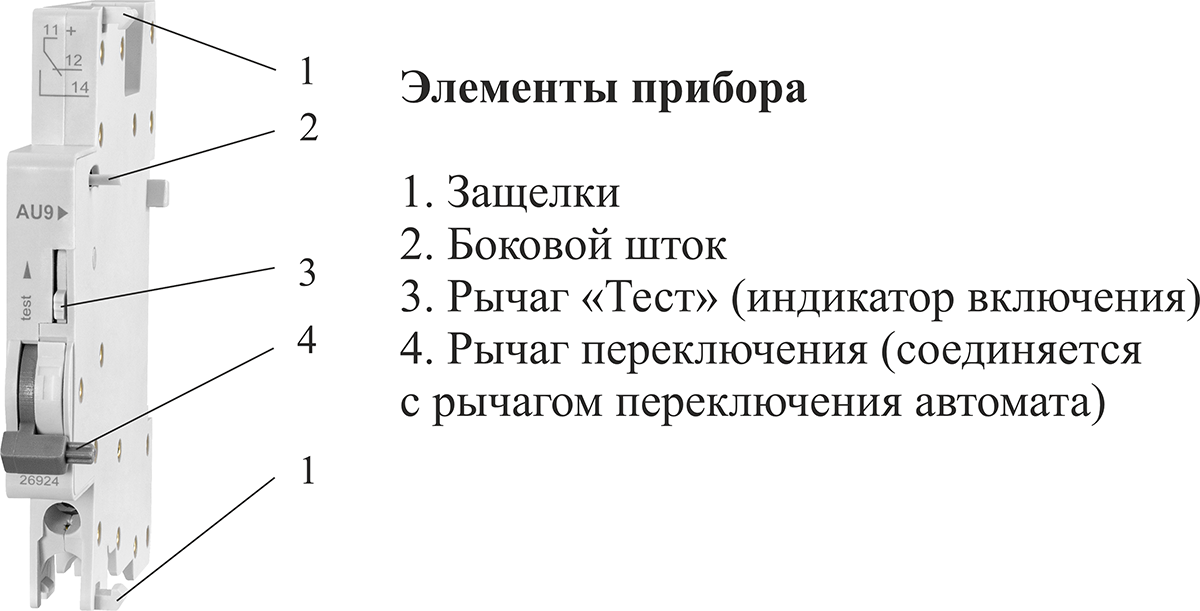 - Переключение контакта происходит как от ручного управления, так и от воздействия на боковой шток (п. 2, см. рисунок) при срабатывании контролируемого автомата