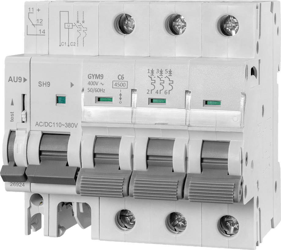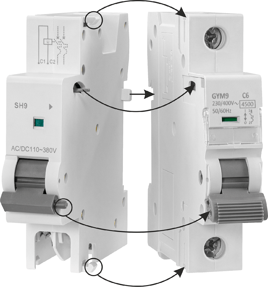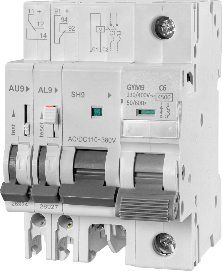 - Может устанавливаться на автомат вместе с аварийным контактом AL9 и дополнительным контактом AU9, возможна установка не более трех приборов одновременно, слева от автомата. Если в сборке используется расцепитель, сначала устанавливается он, затем аварийный и вспомогательный контакты в любом порядке