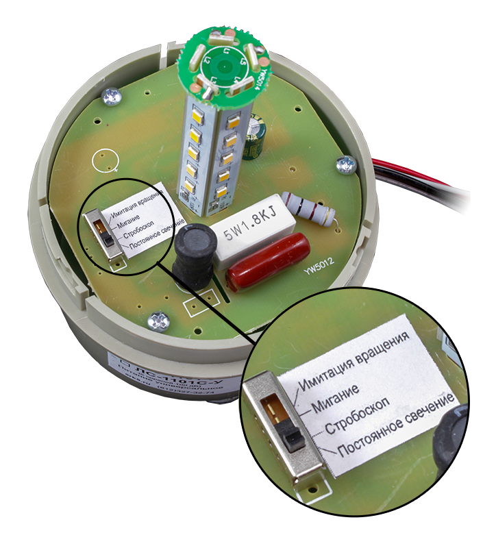 - 4 режима работы: постоянное свечение, стробоскоп, мигание и имитация вращения (см. фото переключателя режимов в галерее)