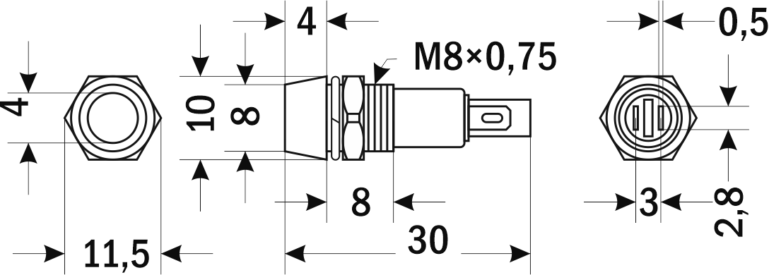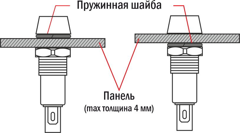- Монтаж в плоские панели толщиной до 4 мм, фиксация стопорной гайкой