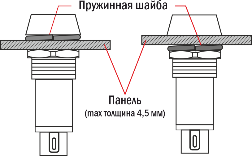 - Монтаж в плоские панели толщиной до 4,5 мм, фиксация стопорной гайкой