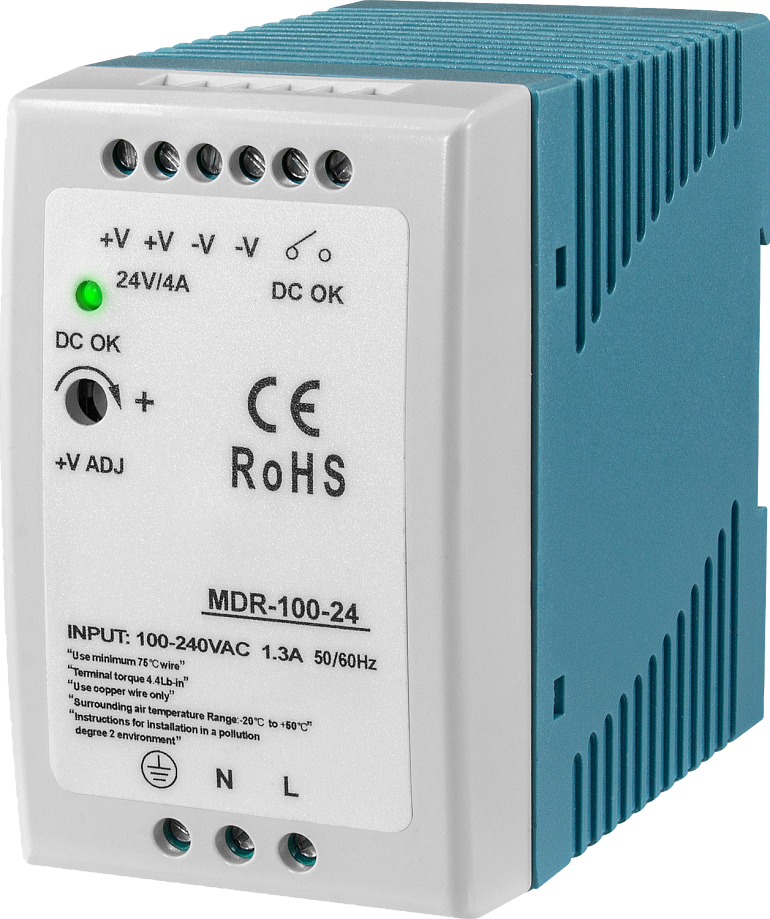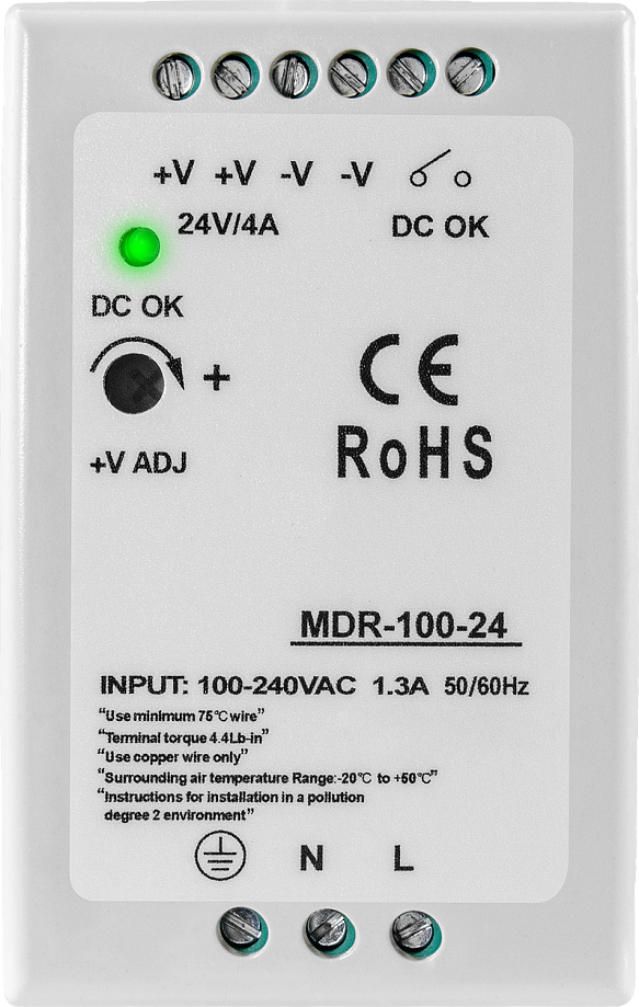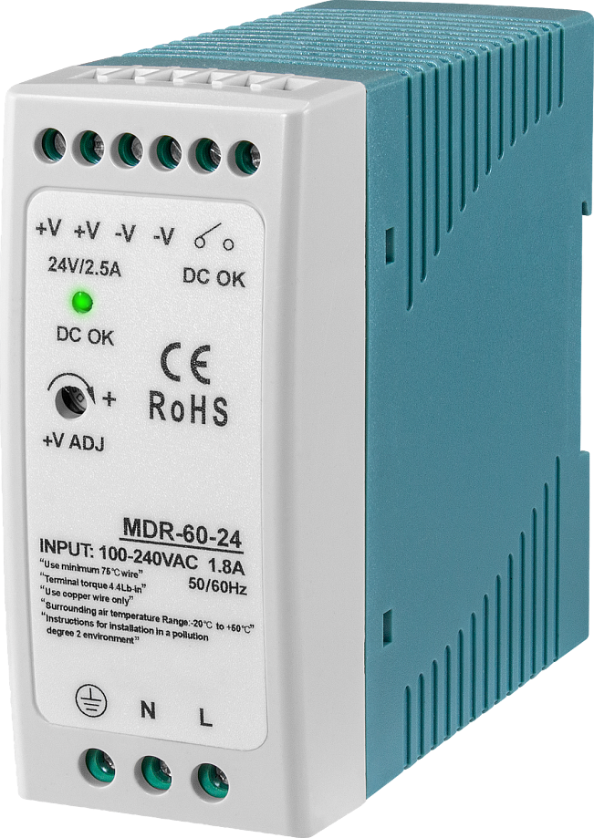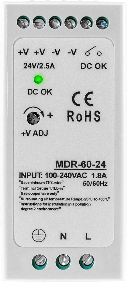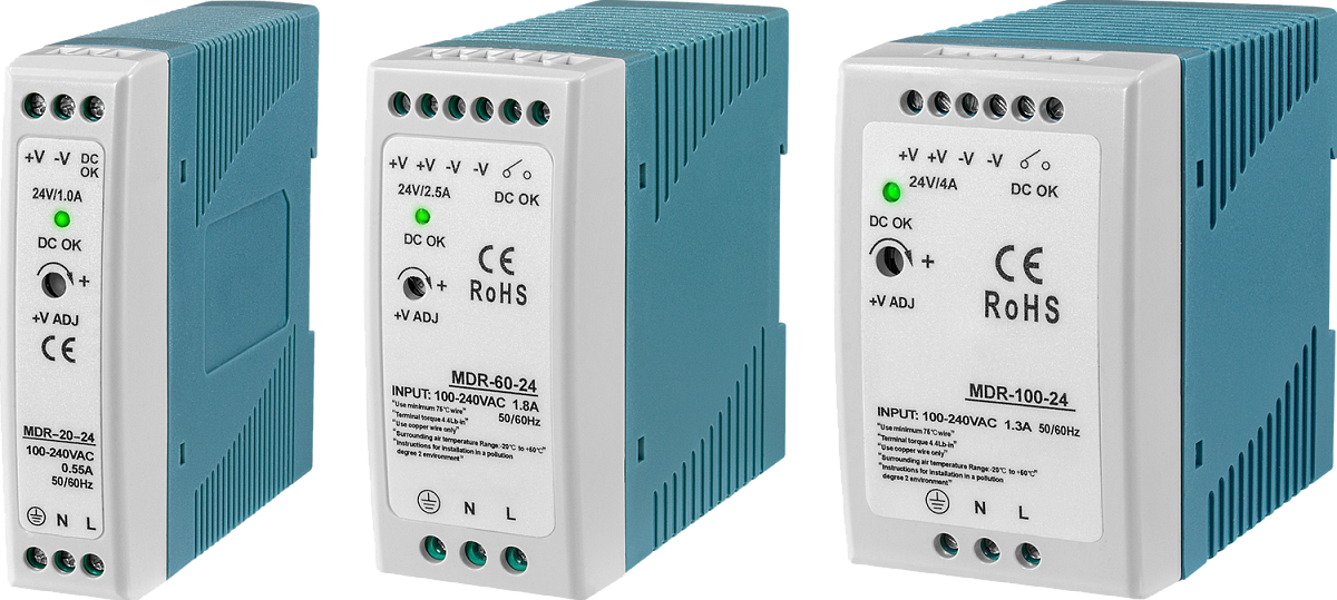 - Сдвоенные клеммы питания для удобного подключения (MDR-60, -100)