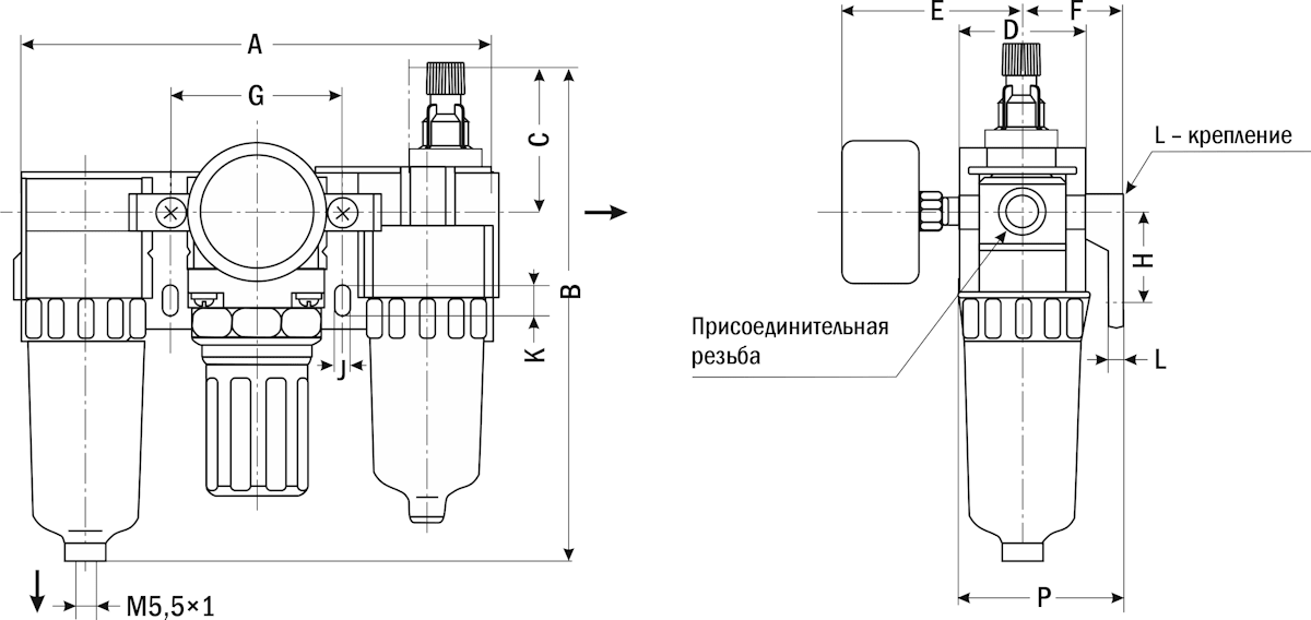 | Расход воздуха, л/мин | Присоединение | Габаритные размеры, мм