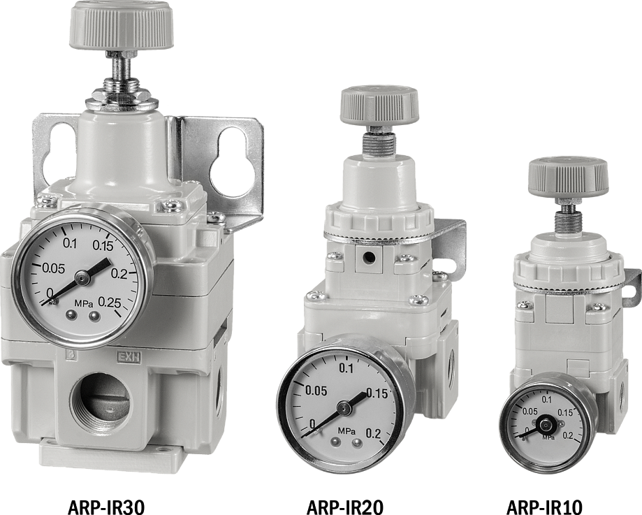 Принцип действия: При вращении настроечной рукоятки регулятора давления ARP-IR происходит сжатие пружины, соединенной с диафрагмой. Диафрагма искривляется, задавая величину пропускного отверстия. Подаваемый на вход воздух, проходя через систему промежуточных диафрагм и открытый главный клапан, выходит через порт выхода. При увеличении давления сверх заданного, нарушается баланс сил, создаваемых диафрагмами. Основной клапан закрывается, открывая выпускной клапан для сброса избыточного давления в атмосферу. Благодаря чувствительности диафрагмы даже к незначительным колебаниям давления, обеспечивается высокая точность регулировки.