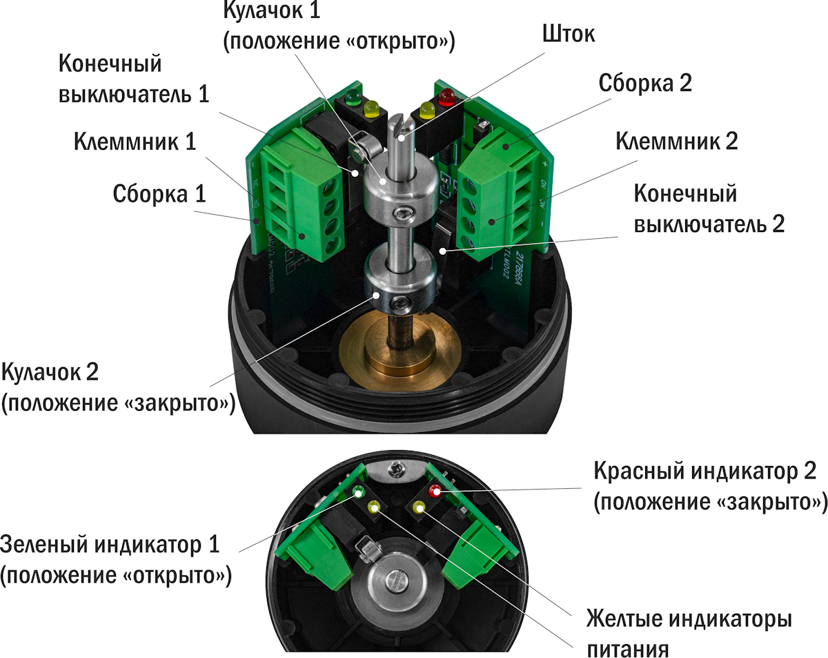 Верхний кулачок 1 при открытом положении клапана воздействует на верхний конечный выключатель 1, происходит переключение «+» Uпит с контакта НЗ на контакт НО сборки 1, загорается зеленый светодиодный индикатор 1. Нижний кулачок 2, соответственно, при перемещении поршня в закрытое положение воздействует на нижний конечный выключатель 2, происходит переключение «+» Uпит с контакта НЗ на контакт НО сборки 2, загорается красный индикатор 2.