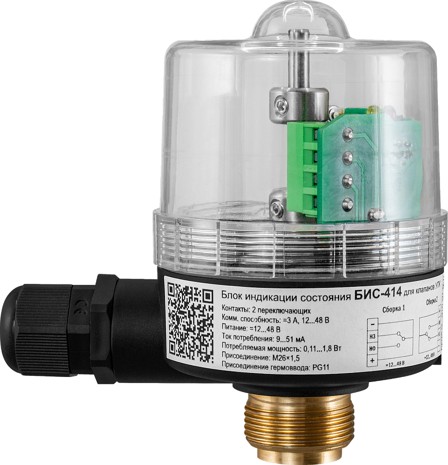 Блок индикации состояния БИС-414 устанавливается на привод клапанов УПК, предназначен для передачи информации о состоянии клапана (открыт/закрыт) в виде электрических сигналов, а также визуальной индикации. Облегчает контроль состояния клапана системой управления и обеспечивает автоматизированную работу