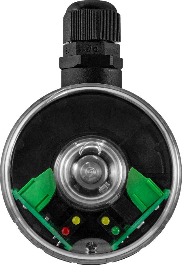 Прибор состоит из пластикового (полиамидного) корпуса с прозрачной крышкой, латунного присоединения с резьбой М26×1,5, кабельного ввода. Внутри корпуса находится шток с закрепленными на нем кулачками и две сборки, каждая из которых включает в себя плату с клеммником, светодиодными индикаторами и конечным выключателем (см. рис. 1).