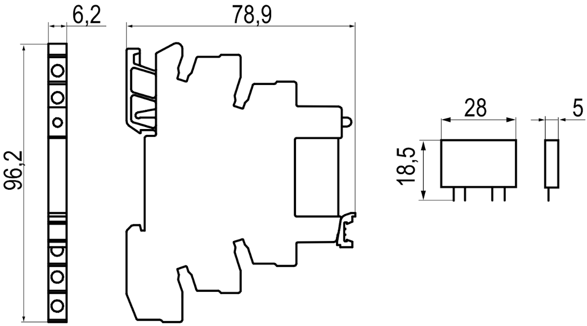 - Компактные размеры реле и колодки (6,2 мм) позволяют экономить монтажное пространство в шкафу.